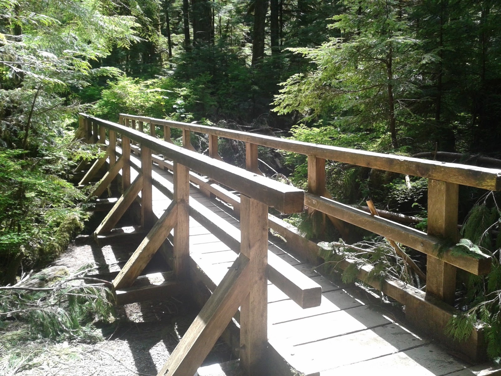 After crossing the bridge, the next mile or so is a steady climb on a well-kept trail. Steps made of wooden logs make it very easy to walk on this trail. Though it is steep in places, there are spots where the trail levels off. These were nice because it gave us quick breaks in between hills. The forest provided shade from the sun for most of the way, but there is a point where the trail opens up as it switches back along the mountain. The views on this stretch of the trail are spectacular! Right across the valley stands Green Mountain. We took some time to rest and snap photos. The sun was beating down pretty hard, so we didn't stay too long.