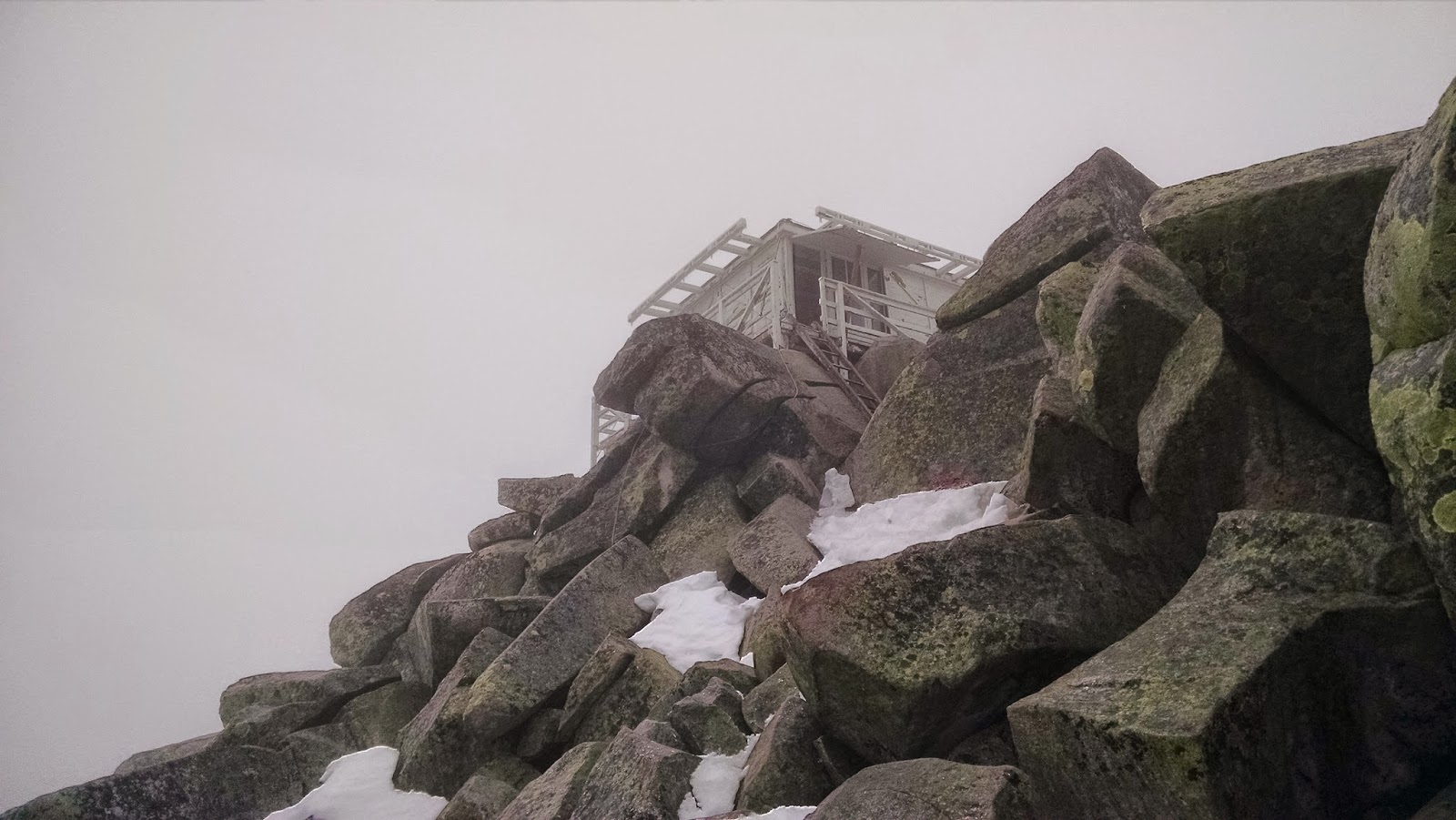 The last switch-back from the top is an open climb up some large boulders. From here, we were able to see the tower through the fog, off in the distance. It was comforting to see! We continued up the snowy trail as it narrowed closer and closer to the top. One final climb through the slick, snow-covered boulders and up a metal ladder, we were inside the lookout tower!